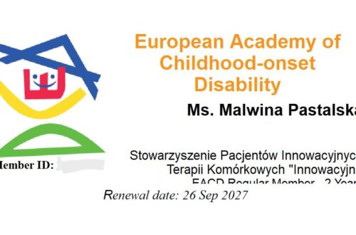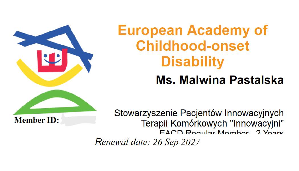 Pod koniec ubiegłego roku nasza Pani Prezes Malwina Pastalska została członkiem European Academy of Childhood-onset Disability (EACD) – prestiżowej, międzynarodowej społeczności działającej na rzecz dzieci z niepełnosprawnościami. To dla nas wyjątkowy moment i ogromne wyróżnienie, a jednocześnie szansa na dalszy rozwój, wymianę doświadczeń i jeszcze silniejsze budowanie międzynarodowej współpracy w obszarze terapii. Jesteśmy poruszeni i pełni wdzięczności. Serdecznie gratulujemy Pani Prezes! 💚